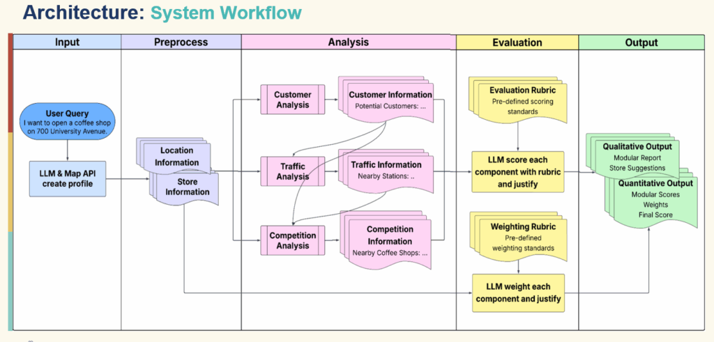 The pipeline is a sequence of specialized agents including the following: understanding, customer, traffic, competition, weighting, evaluation and final reporting. The agent utilizes reusable Python tools for geocoding and map visualization, nearby place search, population and age composition, web search, population and static map image understanding. The agent also utilizes multiple data sources such as map APIs, population datasets, web search APIs, and public review counts to help generate the final report.